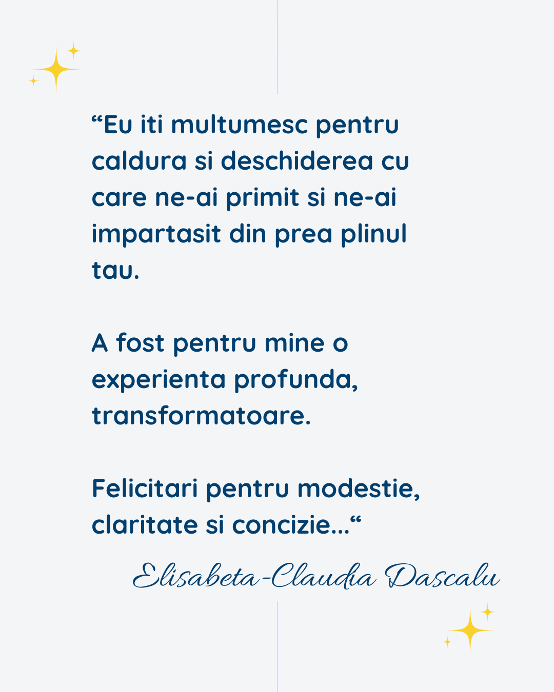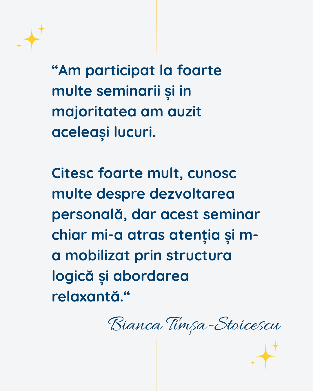 ... imi aduc aminte cu bucurie si amuzament de primele seminarii. Pentru ca am avut o frica imensa de a vorbi in fata oamenilor, insa si chemarea a fost puternica si am avut imboldul pentru a o depasi. Daca la primul seminar, cand am inceput in 2012, cu chiu cu vai au venit 4 persoane , la 1 an dupa, am tinut un seminar cu 400 de participanti, la un hotel de 5 stele, pe Dorobanti. Si apoi peste 10.000 de studenti la seminariile LIVE.